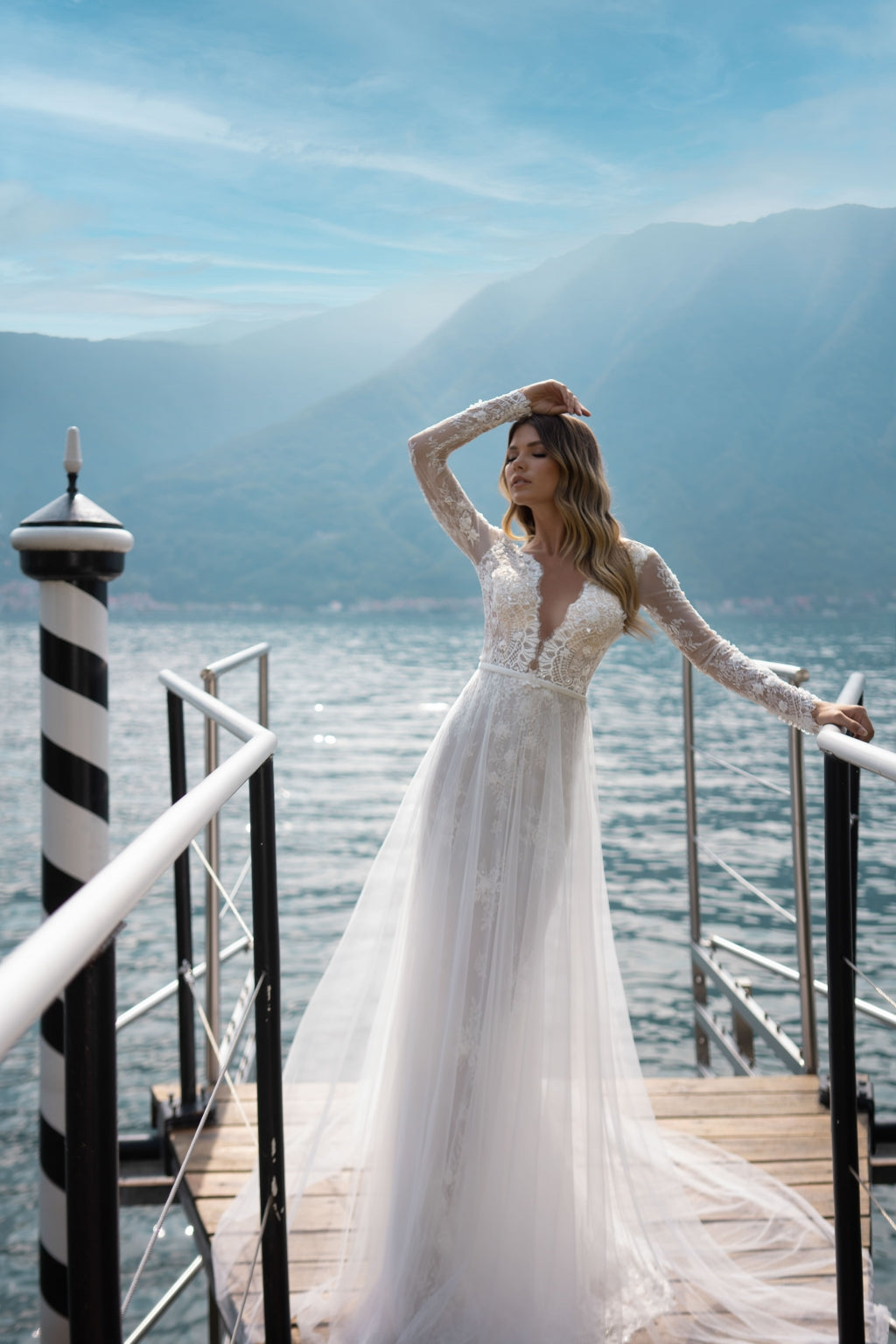 The triumph of love is embodied in Bianca dress. The light texture of lace and flowy soft tulle is complemented by an inviting neckline, which adds uniqueness and charm to the bride’s image.