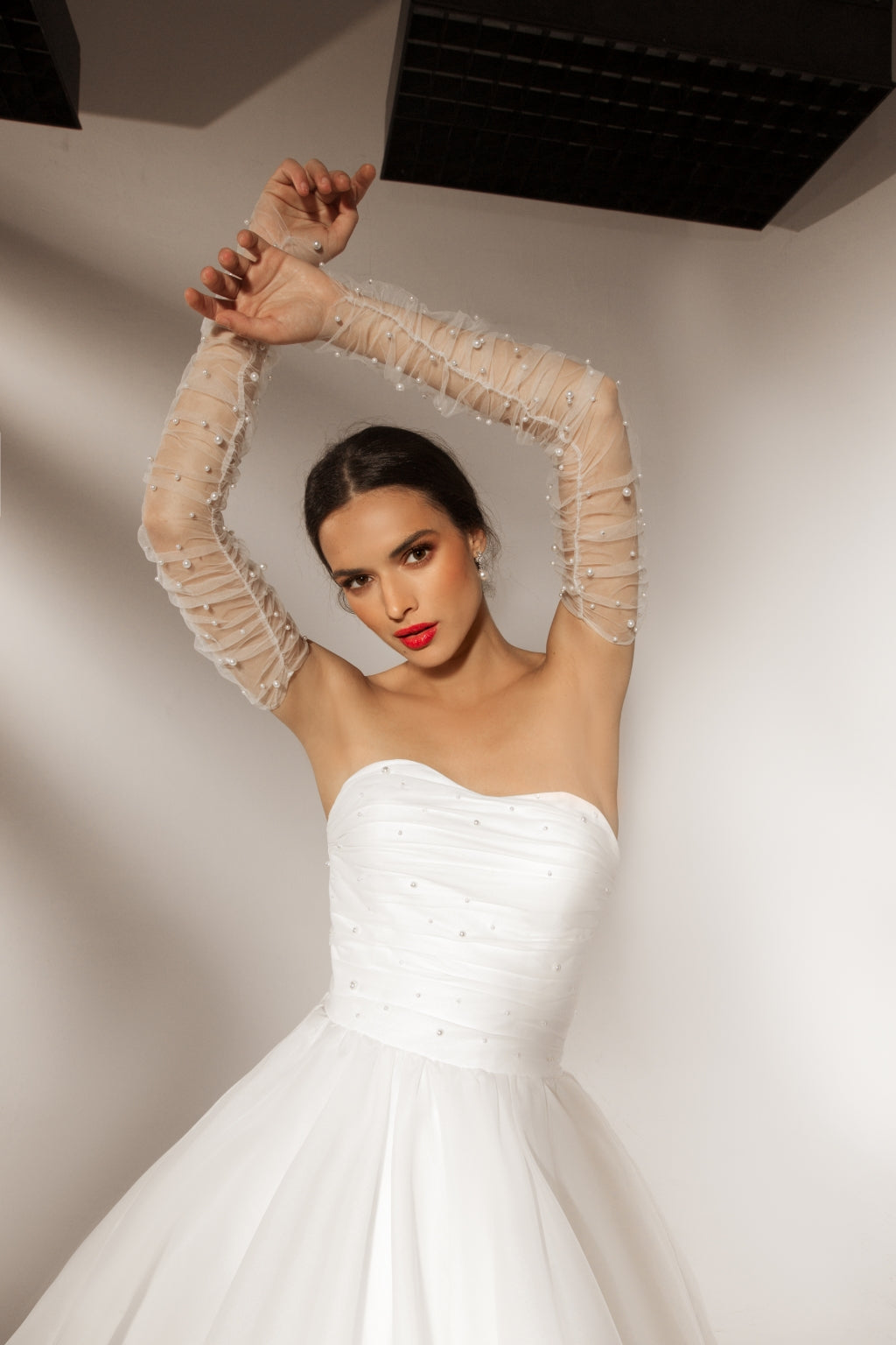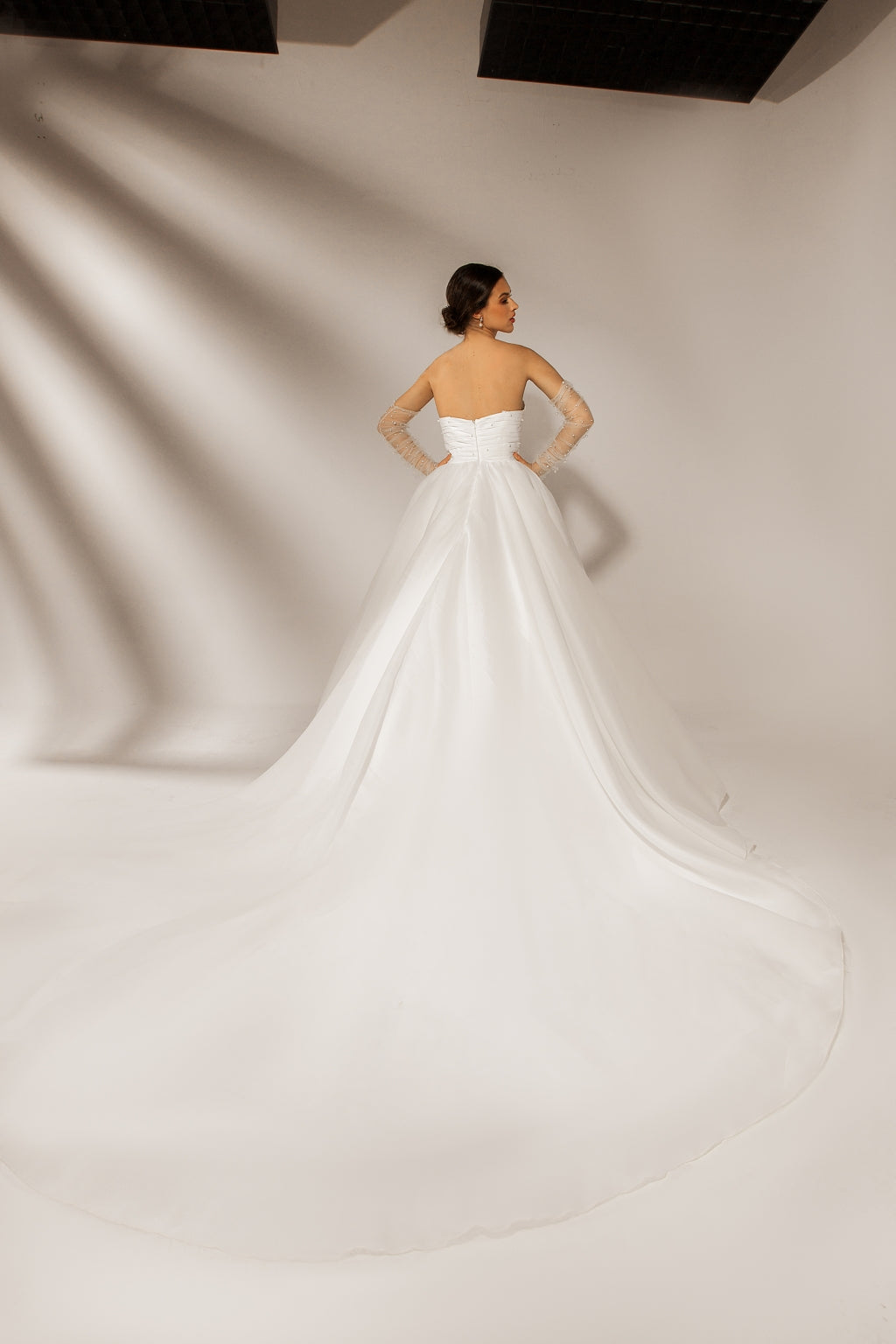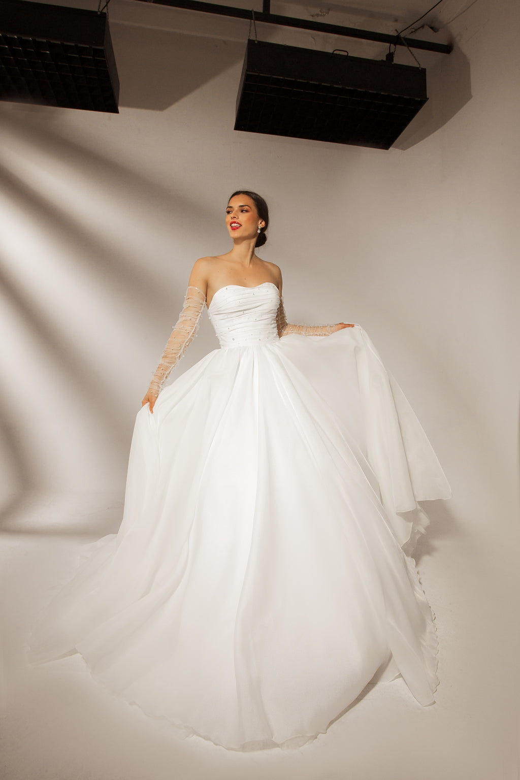 Geneve wedding dress made in organza, which proves that simplicity can be beautiful too. This strapless ball gown dress comes with tiny embroidered details that add charm and a little sparkle to the whole look. Like the city that blends with the Alps, this dress is romanticism in the whole meaning of the words. The gloves are optional but suggested to match the dress.