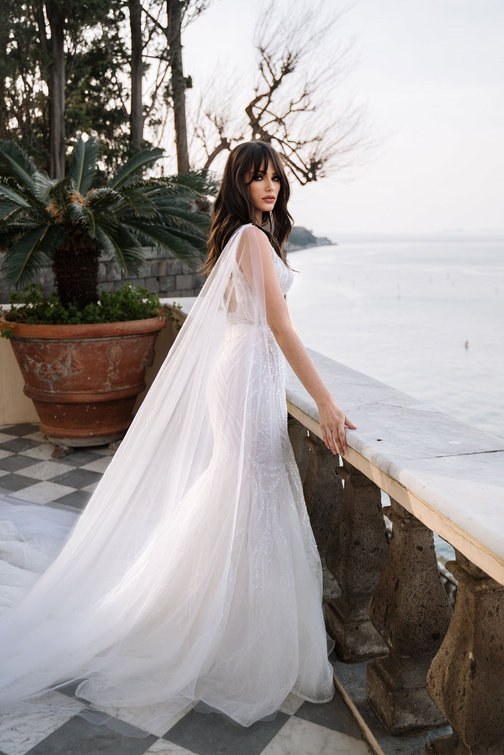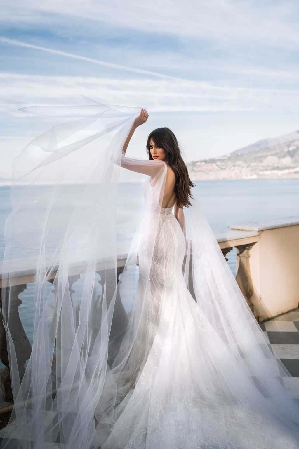 Luxurious lace tulle composes an ultra-glamorous Messina mermaid dress. Fully embroidered lace embellished with sequins accentuates sensual curves, while a square neckline and scoop back create a contemporary look. A tulle overskirt adds volume for a grand entrance.