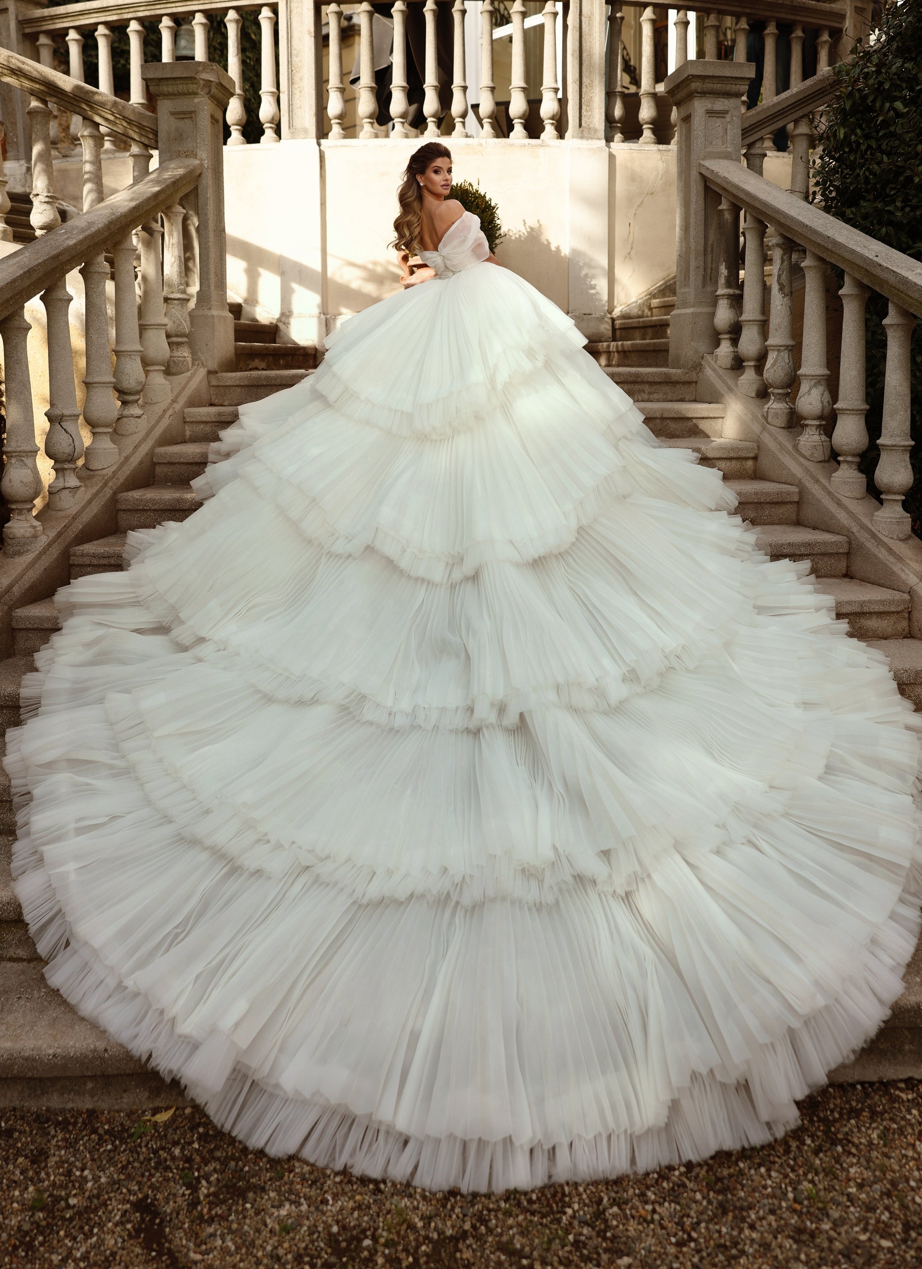 This spectacular ballroom-style “ⅩⅤ” dress will have your floating through your wedding day on a cloud of sparkling soft tulle. Ruffles swathe the body in a voluminous form that is pure fantasy, while a floral embroidered heart-shaped create a seductive counterpoint.