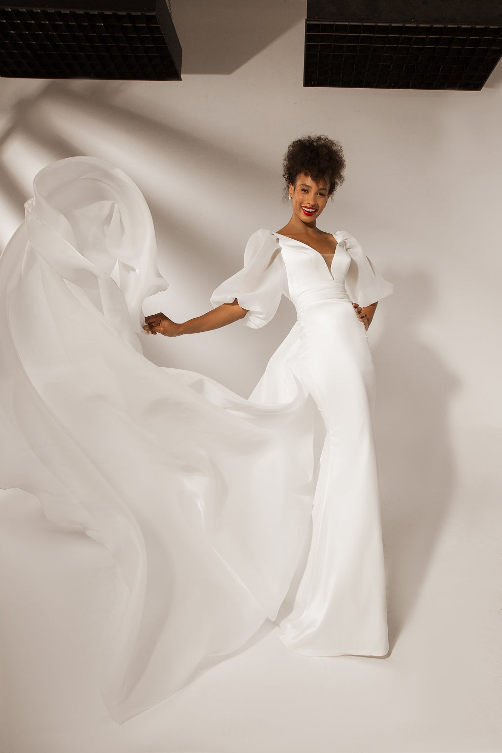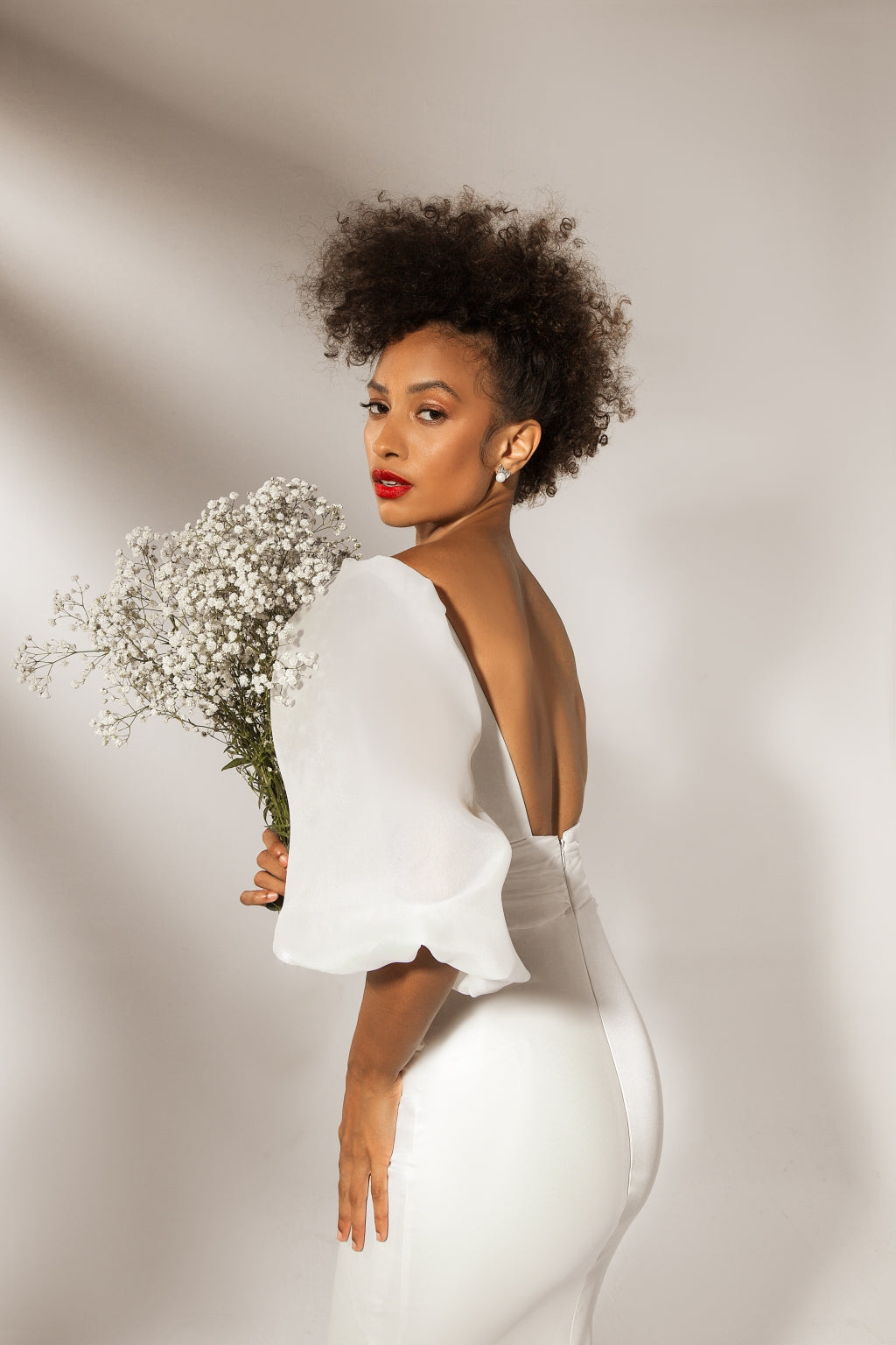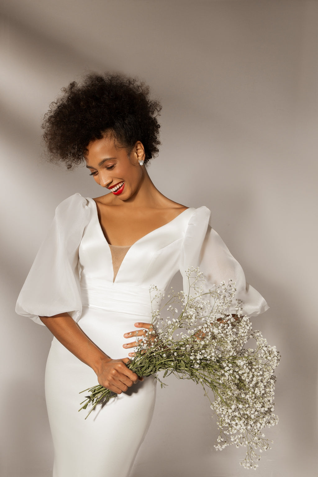 This seath-shape wedding dress made out of silky satin is for those who want to have something elegant but yet fun. The sleeves add movement and keep the design very modern. Florence, like the city, reminds us to appreciate classical silhouettes that remain fresh in current times.