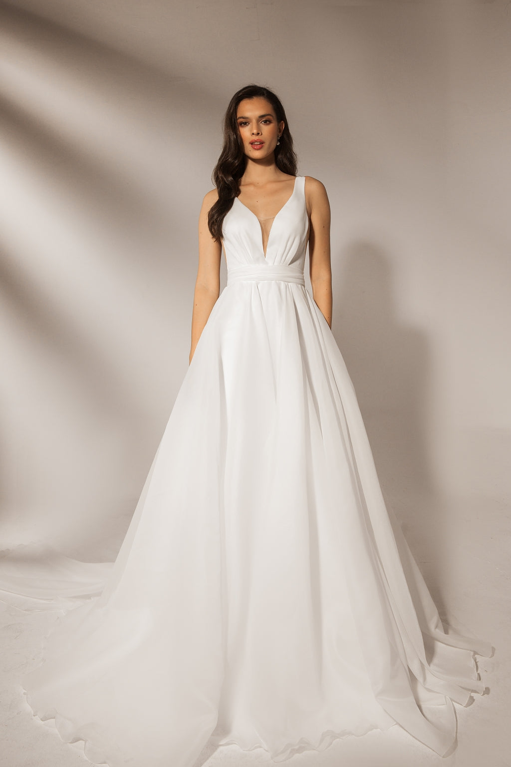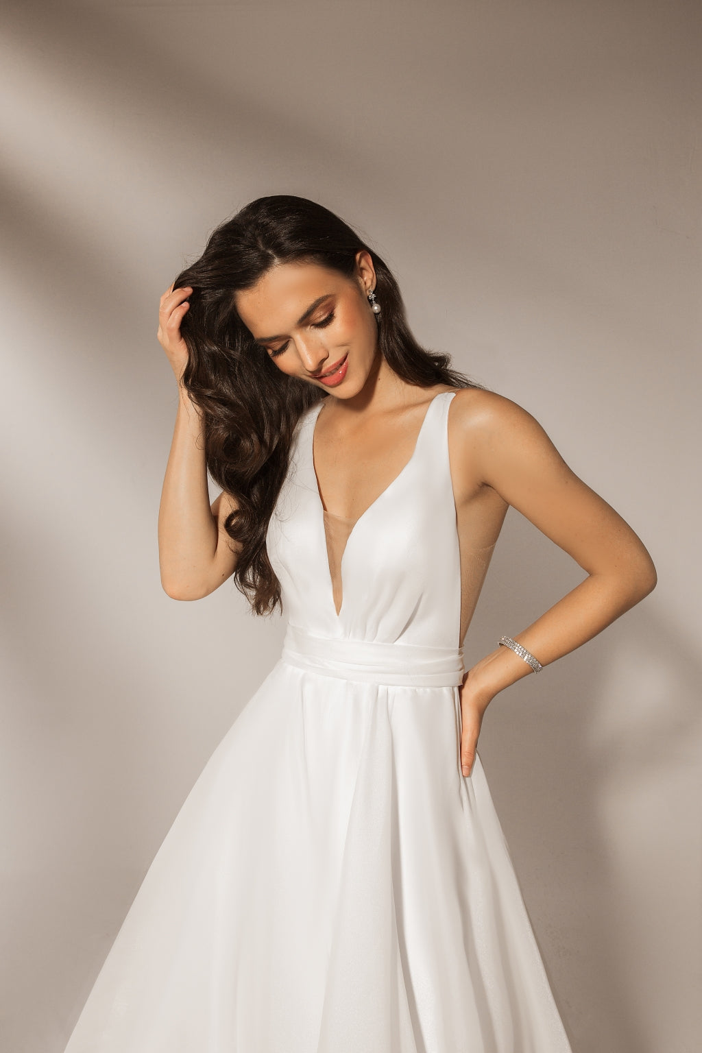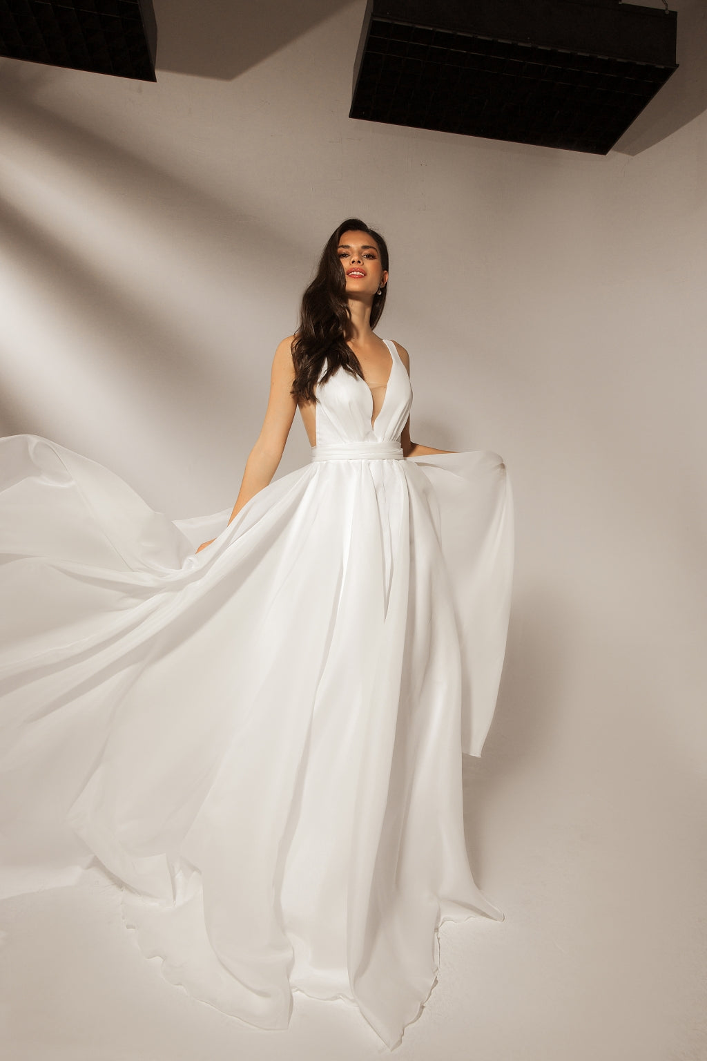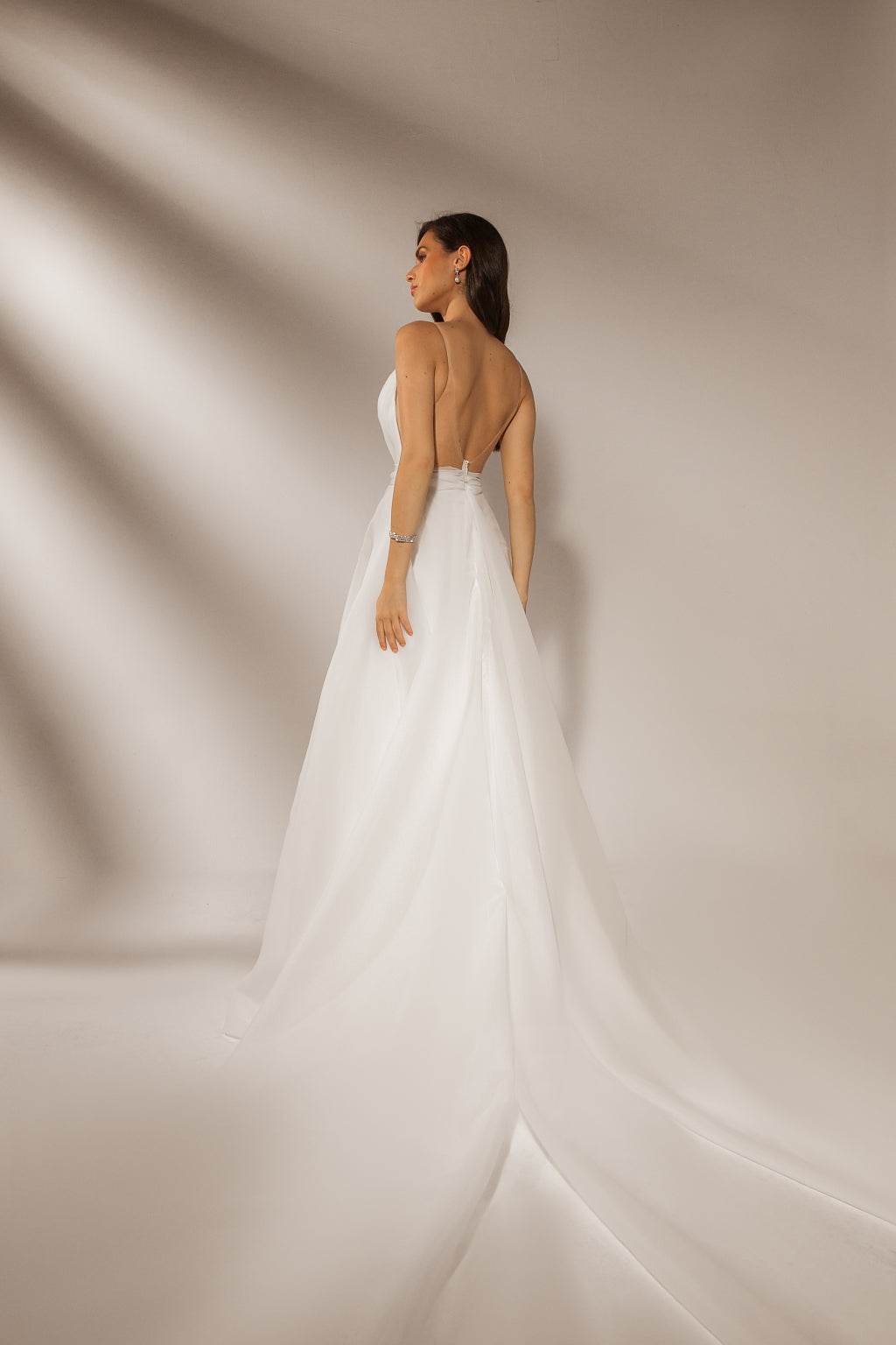 Paris is associated with elegance and luxury, that is why we tried to make this A-line wedding dress look effortlessly in this way. Made out of organza, Paris flows in the air with charm on every movement you do. The stunning neckline and the open back add a subtle and innocent look to it.